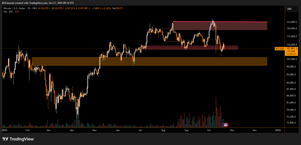 Bitcoin (BTC) fell by 2.5% on Tuesday, slipping to around $107,460 on major exchanges as the market reacted to a possible CME futures gap below current levels. The decline erased early-week gains and revived concerns that $100,000 support could fail if selling continues.