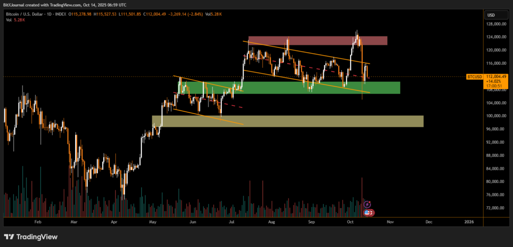 Despite the correction, long-term traders remain cautiously optimistic. “The macro trend remains bullish above $100K,”BITX market analyst explained. “However, the next few sessions are crucial — a failure to defend $110K could trigger deeper liquidations before any sustainable recovery.”