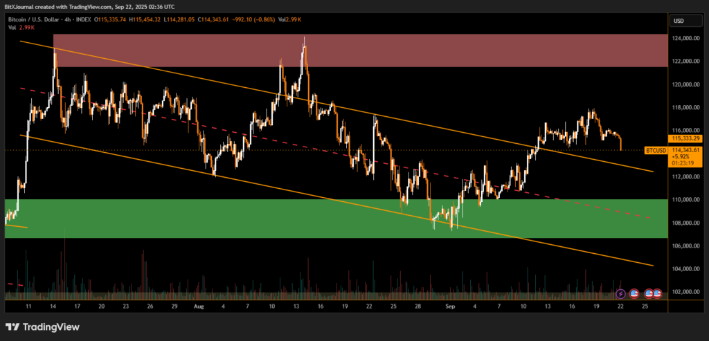 The 4-hour chart shows that Bitcoin was previously moving inside a descending channel, with repeated rejections near the $118,000–$120,000 resistance area. After testing this supply zone last week, BTC has pulled back sharply, now trading around $114,400.