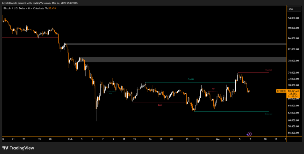 The price of Bitcoin has slipped back below the $70k level after falling roughly 5% over the past two days. The decline returned the asset to its broader monthly trading range as resistance continued to form near the $68,000 mark.