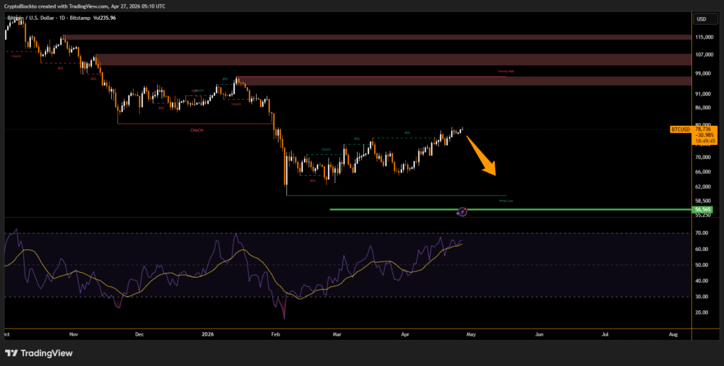 Bitcoin may still be heading toward a deeper correction, with some analysts projecting a potential bottom near $57,000 in October 2026. The outlook comes after BTC rebounded more than 29% from its February low near $60,000, but failed to break through the $80,000 resistance zone, which is now seen as a key barrier before any attempt to reclaim the $100,000 psychological level.
