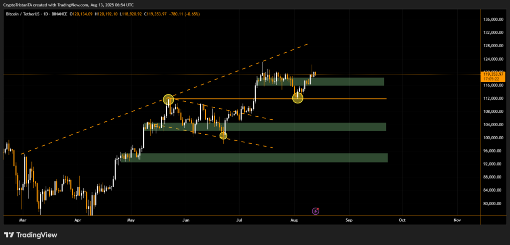 On the daily BTC chart, price action is holding above the $116,000–$118,000 support zone, with the broader uptrend intact inside a rising channel. The next significant resistance stands around $124,000–$126,000, where previous rallies have stalled. Failure to hold current support could open a retest toward the $104,000 and $96,000 demand zones.