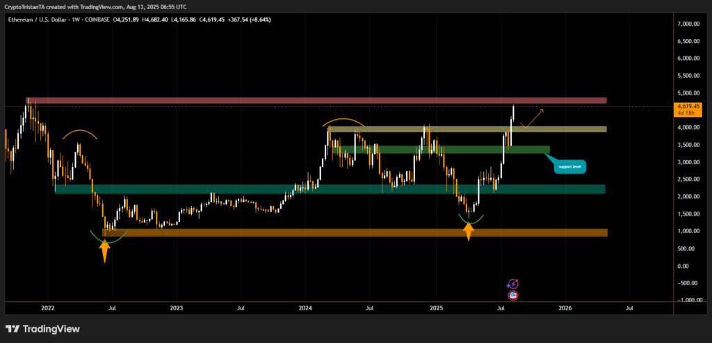 Ethereum’s weekly chart reveals a breakout above the $4,000–$4,200 resistance band, with momentum carrying toward $4,700. This zone coincides with a key historical supply area from the last cycle peak. Below, strong support lies near $3,200, and deeper pullbacks could revisit the $2,400–$2,600 range if momentum falters.