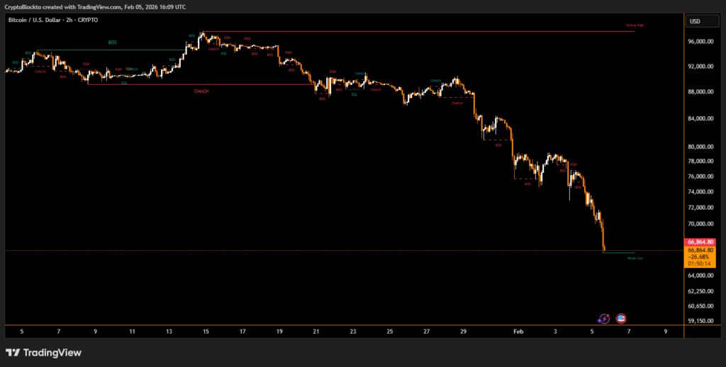 One of the main pressures on price is a reversal in institutional demand. Spot bitcoin exchange-traded funds in the U.S. have shifted from heavy accumulation last year to net selling in 2026, creating a demand gap of tens of thousands of BTC. Retail participation has also remained muted, with pricing premiums on U.S.-based exchanges staying negative since mid-October — a pattern historically associated with bearish market conditions.