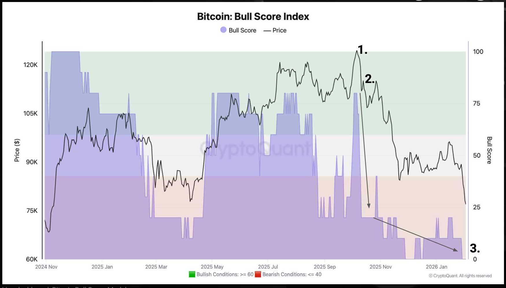 According to CryptoQuant , bitcoin has entered a confirmed bear market phase. A key sentiment metric, the Bull Score Index, has fallen to zero its most pessimistic reading. The index stood near 80 when bitcoin peaked above $120,000 in early October but reversed sharply following a major liquidation event later that month. Analysts now identify a primary support zone between $70,000 and $60,000, with the lower end potentially taking months to reach.
