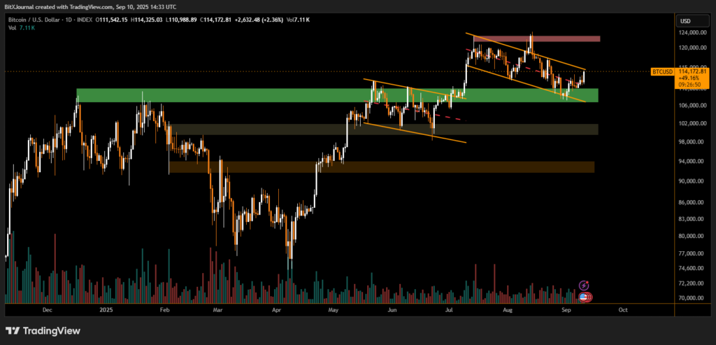 The daily chart indicates Bitcoin recently tested the $110,000–$112,000 support area (green zone), where strong buying interest emerged. This rebound pushed BTC back inside a descending channel pattern (orange trend lines), now targeting upper resistance levels.