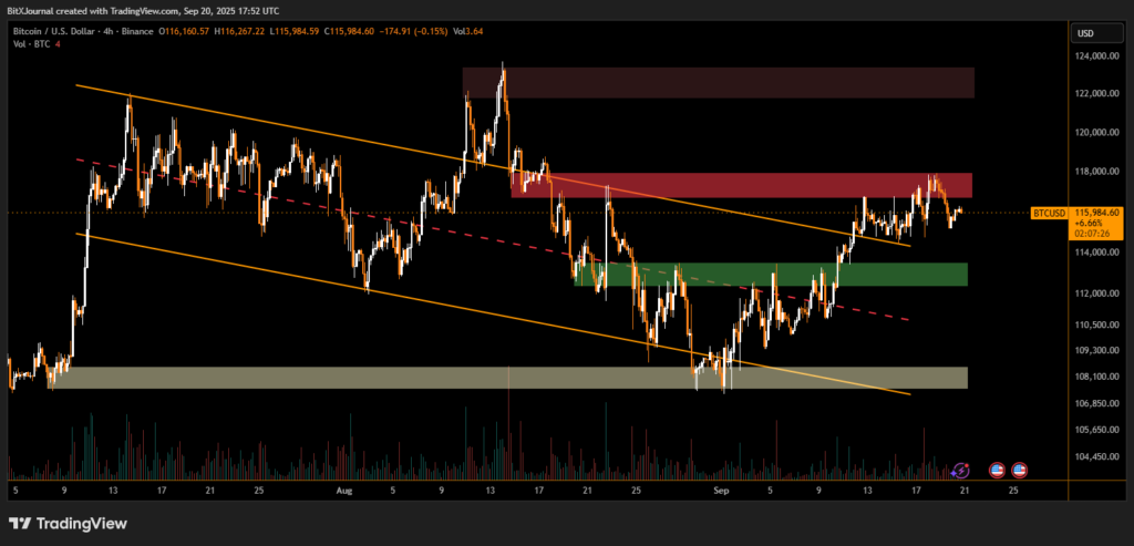 Despite this, long-term traders highlight that the recent recovery out of the falling channel (marked in orange) suggests a structural shift toward bullish momentum., “BTC is still showing strength as long as it holds above $113,500, but buyers need to reclaim $118,000 to keep momentum alive.”