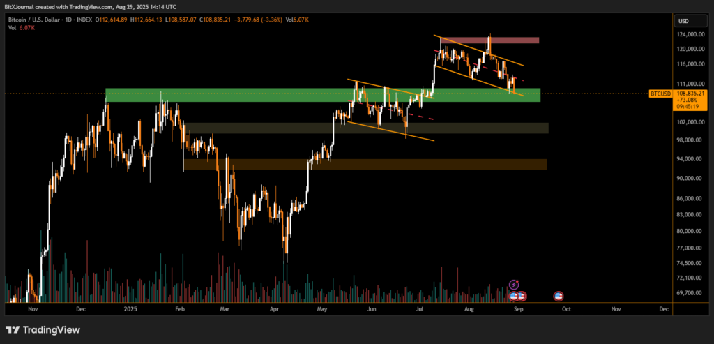 Bitcoin (BTC) fell sharply on Thursday, slipping below the $109,000 mark and testing critical support near $108,500. The move comes after weeks of consolidation inside a descending channel, suggesting that bearish momentum is dominating short-term price action.
