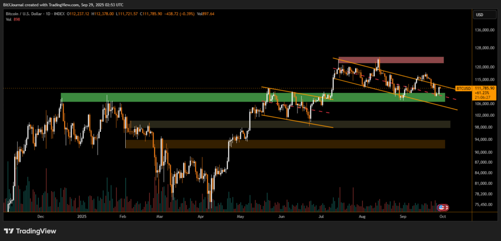 The chart shows Bitcoin breaking through the descending channel pattern that had capped price action throughout September. After bouncing from the green support zone around $107K–$108K, buyers pushed the price above $112K, marking the first strong rebound in weeks.