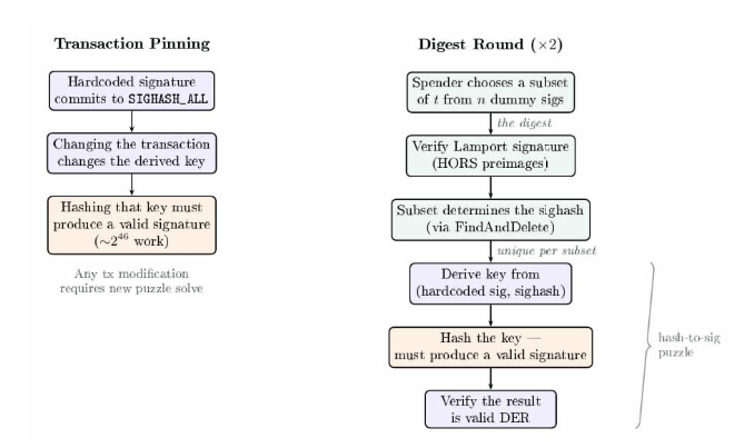 Instead of relying solely on elliptic curve signatures, the system introduces a hash-based puzzle that requires senders to find inputs producing outputs that resemble valid signatures. This brute-force process is designed to remain secure even if quantum computers become capable of breaking current encryption methods.