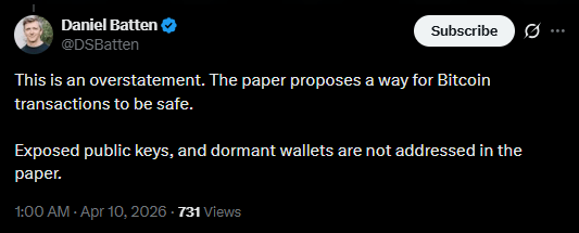 Researchers acknowledged that protocol-level upgrades remain the preferred long-term solution, especially because the approach does not cover systems such as the Lightning Network. Meanwhile, Olaoluwa Osuntokun, chief technology officer at Lightning Labs, introduced a quantum “escape hatch” prototype allowing users to verify wallet ownership using seed phrases without exposing them. A recent quantum research paper from Google has also intensified urgency around preparing Bitcoin for future cryptographic threats.