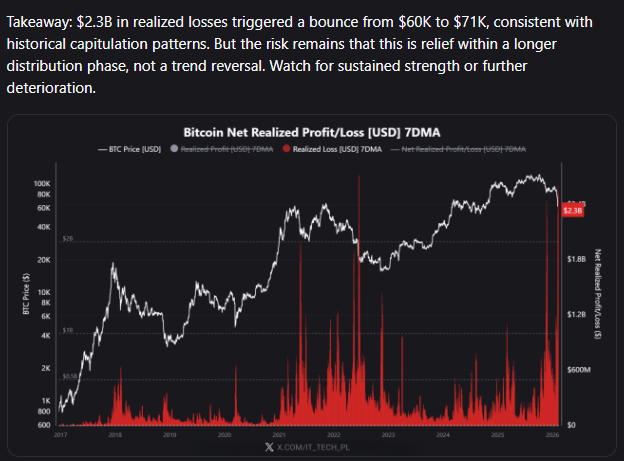 Bitcoin has recorded $2.3 billion in seven-day average realized net losses, marking one of the most significant capitulation events in its history, according to data shared by analysts .