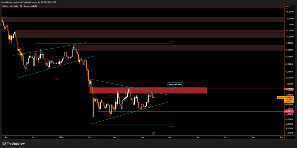 Bitcoin previously climbed about 5.8% from April 6, briefly rising above $73,000, before retreating to around $71,000 on April 11 after failed negotiations between the United States and Iran. Analysts at Kobeissi Letter described the breakdown as a worst-case scenario for markets. Following the stalled talks, U.S. President Donald Trump ordered a naval blockade around the Strait of Hormuz, directing naval forces to intercept vessels paying tolls to Iran, a move that further intensified uncertainty across global markets.