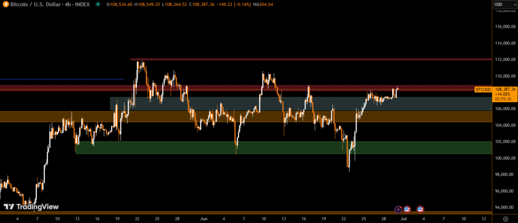 • Formed a descending channel, then rebounded near $108K by the end of day