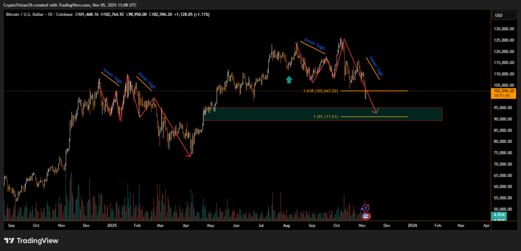 For now, the $100,000 mark remains the key psychological and technical battleground â one that could determine whether Bitcoinâs next major move is a rebound or a retreat toward $72,000.