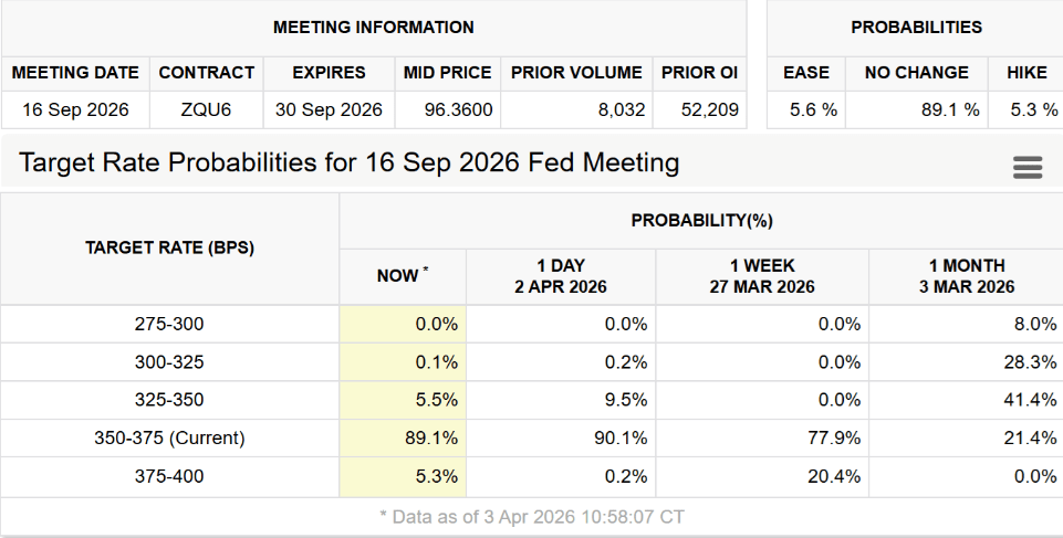 Interest rate expectations remain steady, with traders pricing an 89% chance that the Federal Reserve will hold rates unchanged through September and only a 5% chance of a hike to 4%.