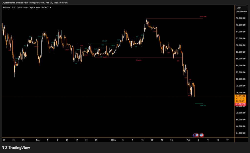 Bitcoin fell sharply over the weekend, breaking below its recent support near $74,000 and sliding toward the $72,000 level as a broad selloff in global equities intensified pressure across risk assets. The move underscores how closely crypto markets remain tied to macro sentiment, particularly during periods of stress in U.S. stocks.