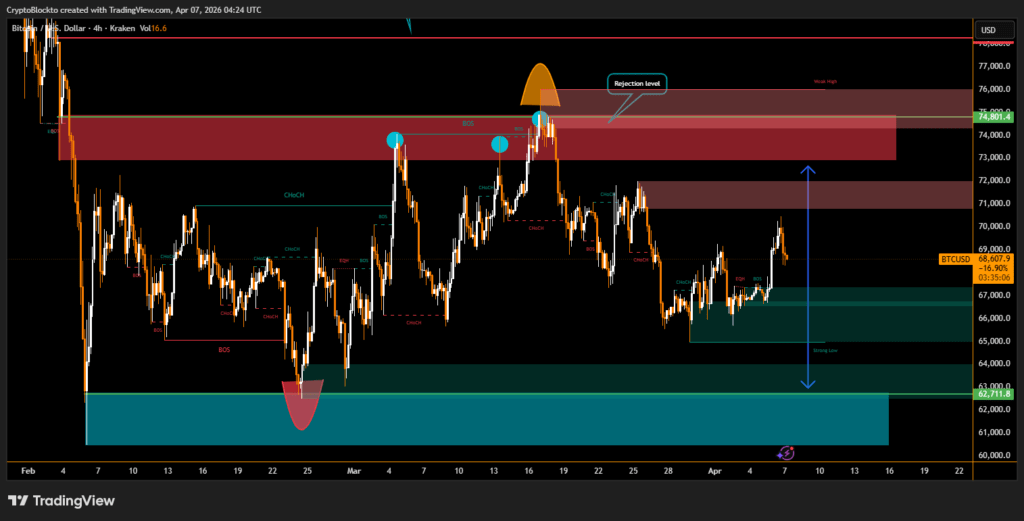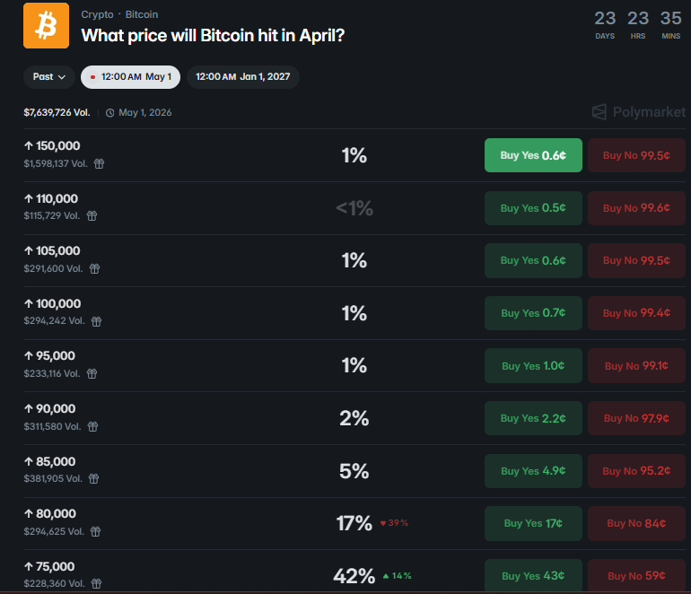 Prediction market activity on Polymarket shows traders assigning a 68% probability that BTC will trade at or below $65,000 in April, while higher targets like $80,000 have seen falling odds.
