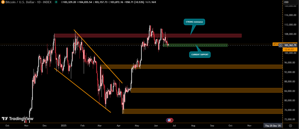 Bitcoin (BTC) fell nearly 4% in the past 24 hours, dipping from a high of $106,552 to $102,411, before stabilizing near $103,813. This move has pushed prices below the key psychological level of $104,000, rekindling fears of deeper losses.