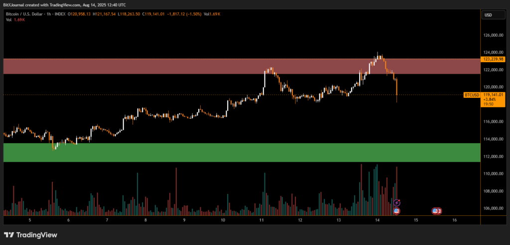 The BTC/USD pair touched an intraday high near $123,239, a key resistance zone marked by heavy selling pressure, before reversing sharply. By midday, prices had broken below $119,000, erasing earlier gains. The sell-off was accompanied by a spike in trading volume, indicating heightened market activity and profit-taking.