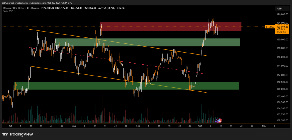 The latest 4-hour chart shows Bitcoin testing the $122,000–$120,000 range, an area that previously served as a strong breakout zone. After a steep climb out of a descending channel pattern in late September, BTC hit resistance just under $124,000, forming a short-term supply zone marked by profit-taking and reduced momentum.