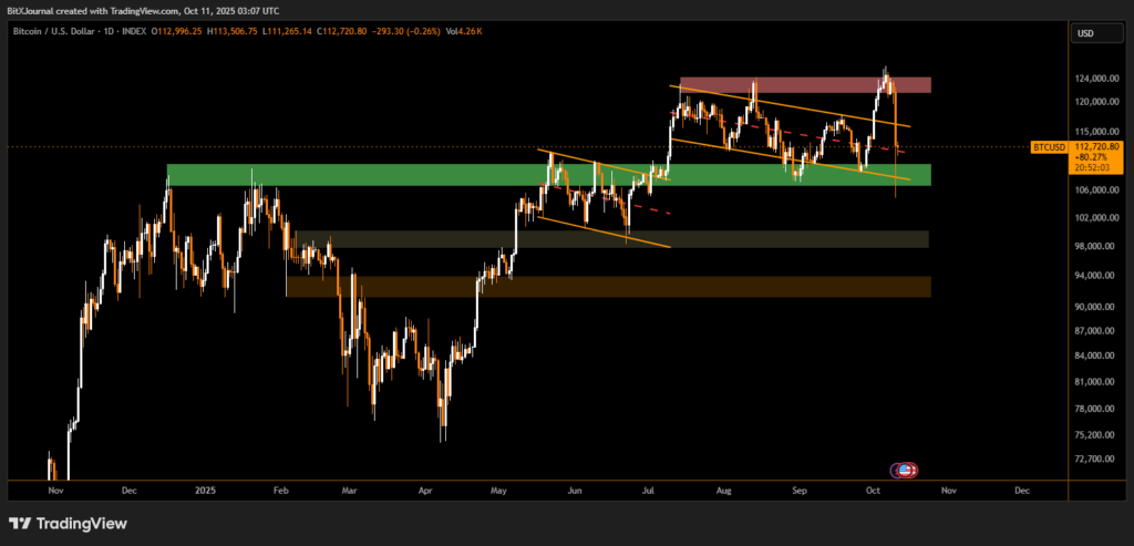 At the time of writing, Bitcoin (BTC/USD) trades near $113,700, recovering from a sharp drop to $102,000 following former U.S. President Donald Trump’s announcement of a 100% tariff on China. Earlier this week, Bitcoin had reached a new all-time high of $125,100, before macroeconomic headlines triggered a wave of selling pressure.