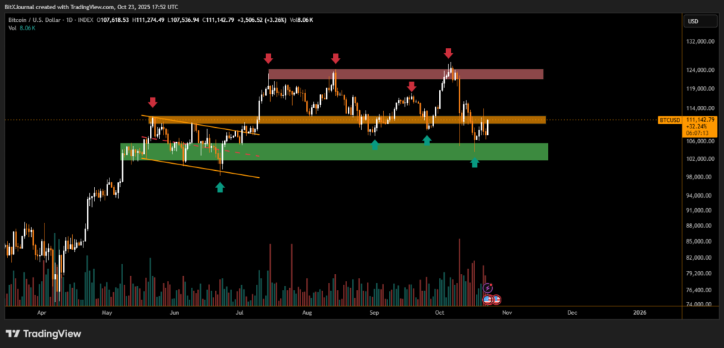 According to technical data, Bitcoin’s recent rebound from the $106,000 support zone suggests that institutional demand remains firm. The asset has repeatedly tested this level over the past months, forming a solid accumulation base that now acts as a springboard for potential gains.