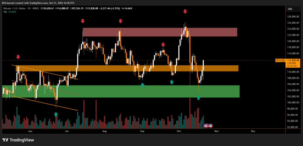 On the technical charts, Bitcoin’s strong rebound came after retesting a major demand zone near $104,000, a level that has historically acted as a key accumulation area. Analysts note that the breakout above the $110,000 resistance marks the beginning of a potential continuation phase, supported by increasing trading volumes and renewed institutional interest.
