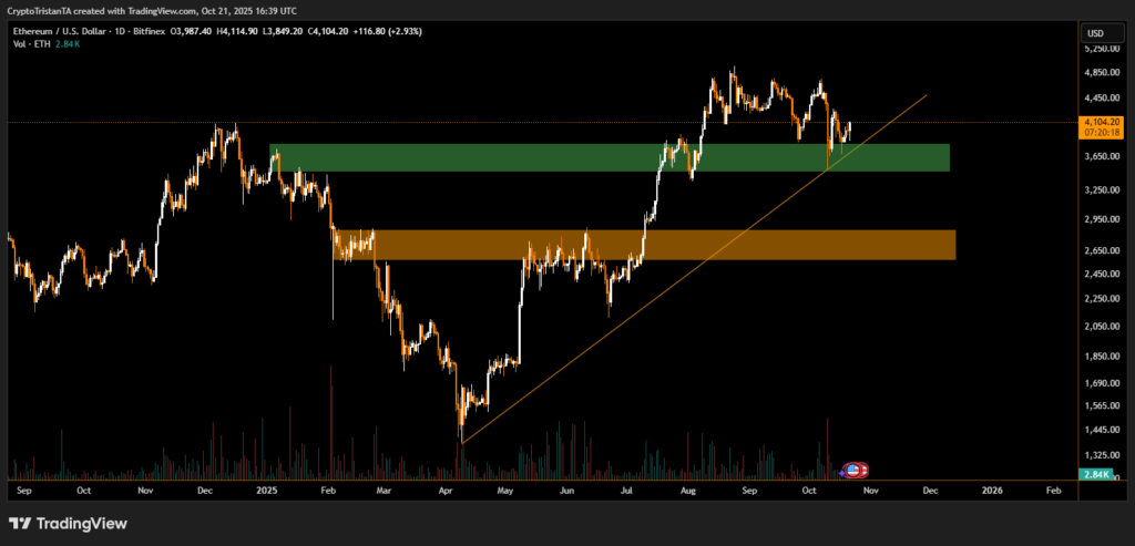 Meanwhile, Ethereum has climbed back above $4,100, maintaining a steady uptrend since early October. The move follows weeks of consolidation and aligns with bullish momentum across major altcoins. The breakout above the $3,900–$4,000 resistance zone has opened the door for potential retests of the $4,500 region, according to traders monitoring the daily trend.