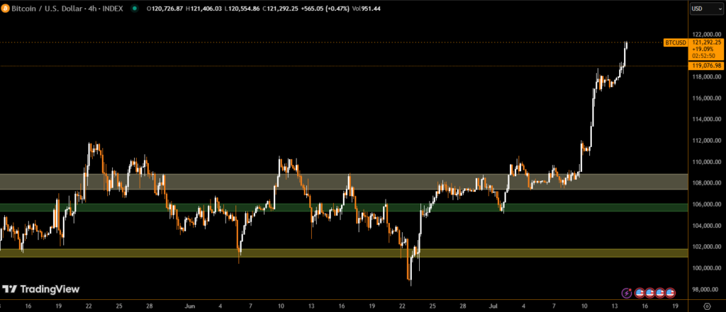 BTC is currently trading at around $120,915, up sharply from a recent low near $96,000 in late June.