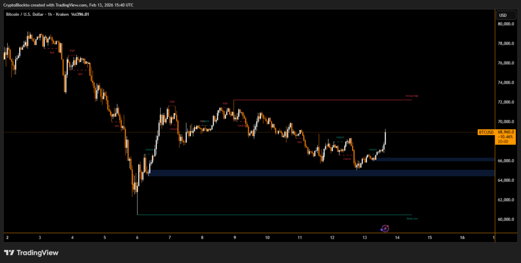 While some traders anticipate the formation of a higher low, others remain cautious, noting that sustained momentum above $69,000 is needed to confirm a stronger bullish shift.