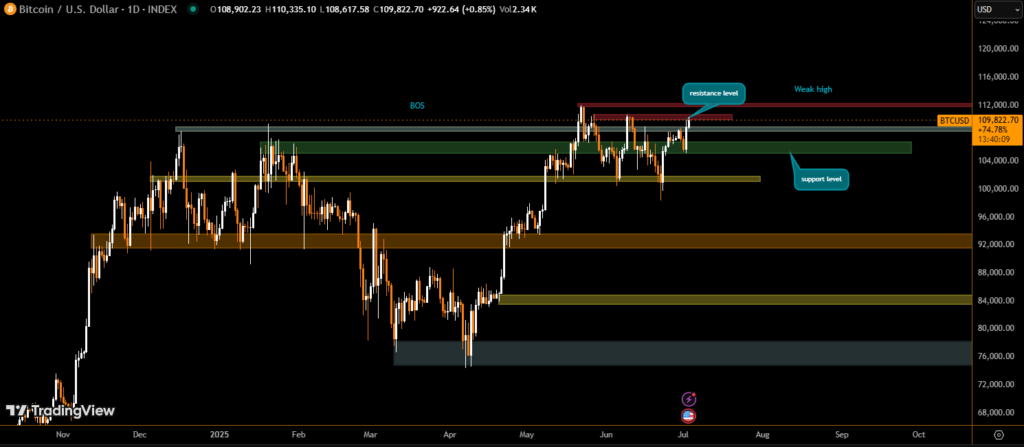 With BTC/USD trading at $110,300 as of the latest update, traders are eyeing resistance near $111,800–$112,500, the high set during the first week of June. A decisive break above this zone could pave the way for a move toward the $115,000–$120,000 range.