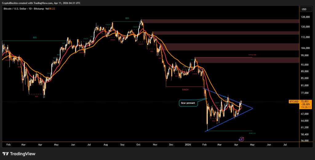 Bitcoin continued its upward momentum, climbing above $73,000 as traders assess the possibility of a move toward $80,000 before the end of April. The rally gained traction after Bitcoin invalidated a bearish pennant pattern earlier in the week, breaking above the $70,000 trendline and reaching a six-week high near $73,300.