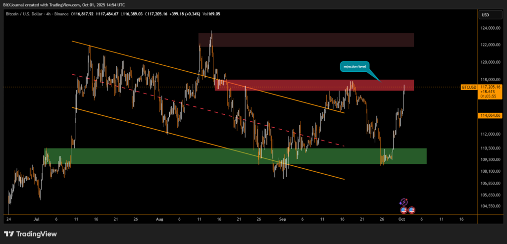 Bitcoin (BTC) surged past $117,000, testing a well-defined rejection level that has repeatedly capped rallies in recent weeks. The move comes as buyers regained momentum from the $110,000 support zone, driving optimism of a potential breakout above the mid-term downtrend.