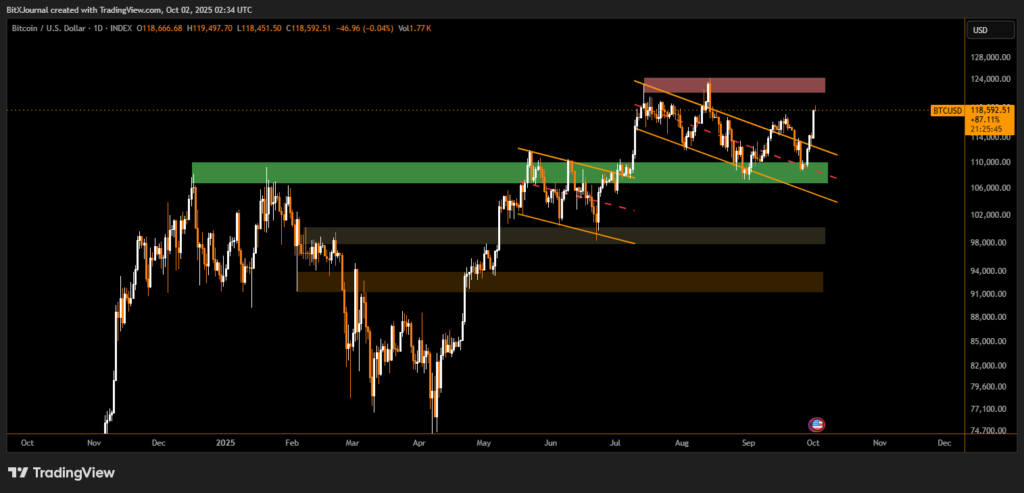 Bitcoin (BTC) surged past $117,000, testing a well-defined rejection level that has repeatedly capped rallies in recent weeks. The move comes as buyers regained momentum from the $110,000 support zone, driving optimism of a potential breakout above the mid-term downtrend.