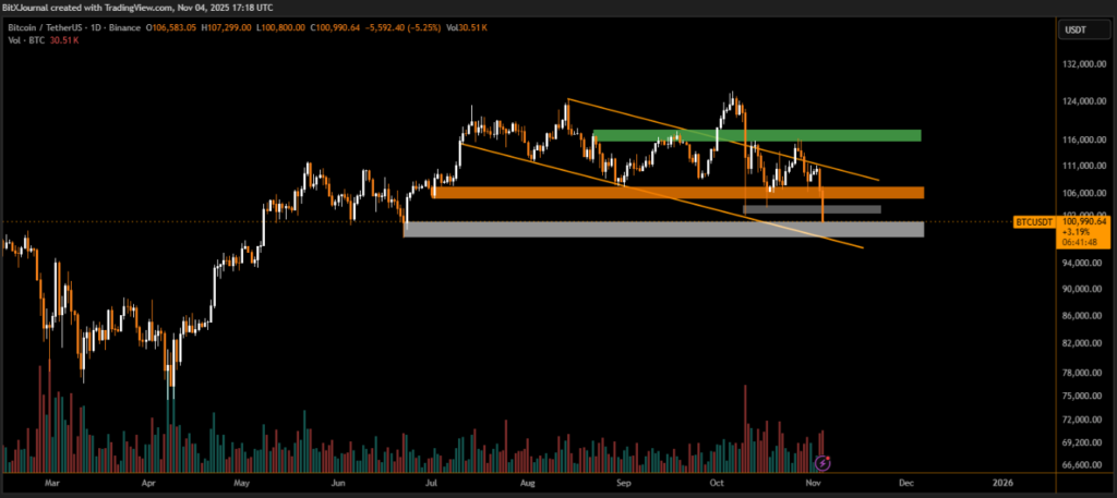 At press time, Bitcoin (BTC/USDT) traded near $100,990, down over 5% in the past 24 hours. The recent decline has pushed BTC to retest the October lows, as seen in the daily chart, where the price remains confined within a descending channel. The lower boundary around $100K now acts as the last major defense zone before the next structural support near $97,000–$98,000.