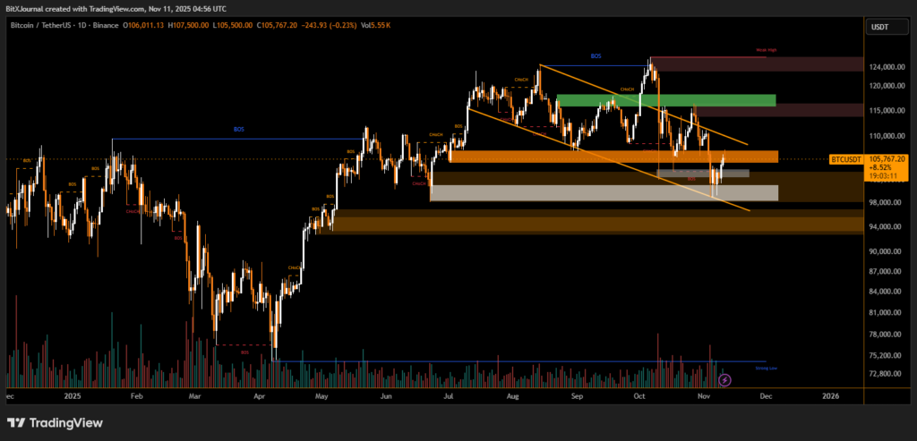 On the daily chart, Bitcoin recently broke out of a descending channel, with price reclaiming a previous structure break (BOS) area — a move many traders view as an early sign of bullish intent. The recovery above the $105,000 support region marks a critical inflection point that could determine the market’s next macro move.