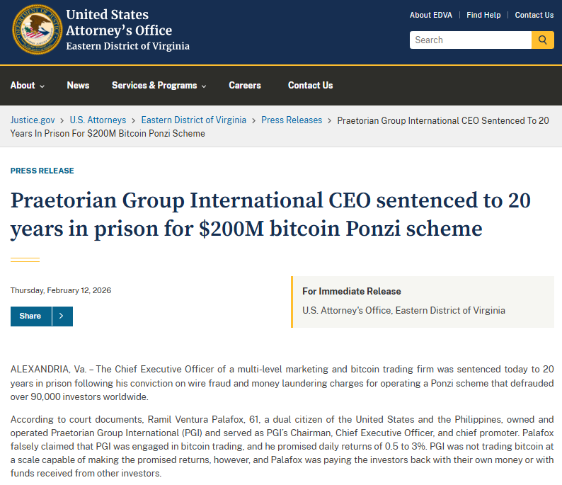 A U.S. federal court has sentenced the chief executive of Praetorian Group International to 20 years in prison for orchestrating a $200 million bitcoin Ponzi scheme that impacted tens of thousands of investors across the globe.