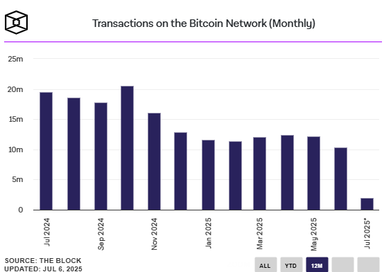 In parallel with the drop in volatility, Bitcoin’s monthly transaction count has also declined. June 2025 recorded the lowest number of on-chain Bitcoin transactions since October 2023, falling by 15% compared to May.