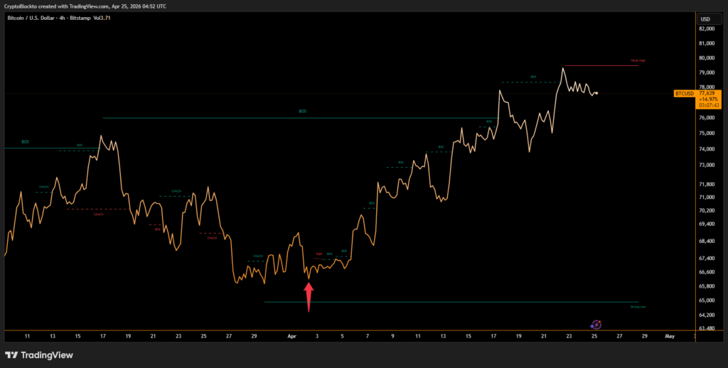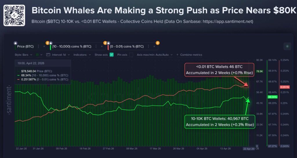Bitcoin whales are rapidly increasing their holdings as Bitcoin approaches the $80,000 level, signaling growing confidence among large investors. According to crypto analytics firm Santiment, wallets holding between 10 and 10,000 Bitcoin accumulated 40,967 BTC since April 10, valued at approximately $3.17 billion based on current market prices. During this period, Bitcoin climbed to a high of $79,327 before retracing to around $77,400, showing continued momentum near a major resistance level.