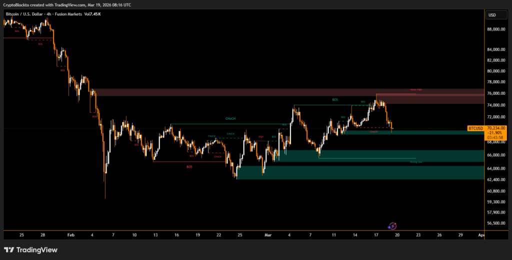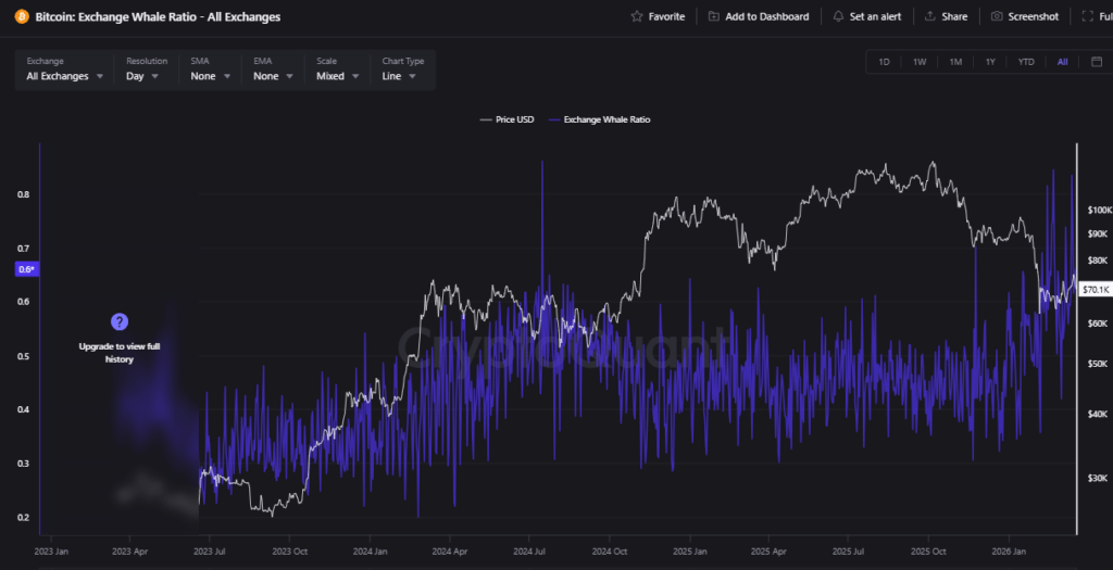 Data from CryptoQuant highlights a surge in large holder activity. The Bitcoin exchange whale ratio reached 0.83 on March 14, indicating that the top 10 deposits made up 83% of total exchange inflows. The ratio remains elevated at 0.66, suggesting whales continue to dominate selling pressure.