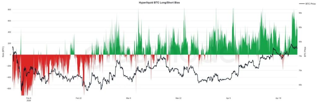 These traders, typically managing positions exceeding $10 million, have historically led spot market movements rather than followed them. The shift to a net-long stance occurred before Bitcoin rebounded from the mid-$60,000 range in February to near $80,000 in April, reinforcing the view that large traders anticipated the recovery. Current positioning now represents the most aggressively long bias recorded in recent dataset trends.