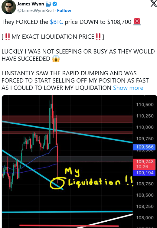 Wynn claims he’s the target of price manipulation efforts, stating that large traders try to shake him out — a reminder that liquidity games are alive and well even in six-figure BTC territory.