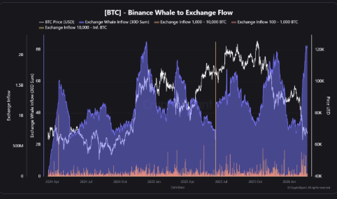 On the exchange side, whale related Bitcoin flows into Binance reached $8.24 billion over the past month, a 14-month high. At the same time, gross whale withdrawals averaged 3.5% of total exchange held supply on a rolling 30-day basis, translating to roughly 60,000 to 100,000 BTC moving off platforms.
