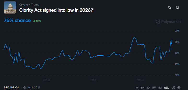 Polymarket currently assigns a 70% probability that the Clarity Act will be signed into law in 2026.