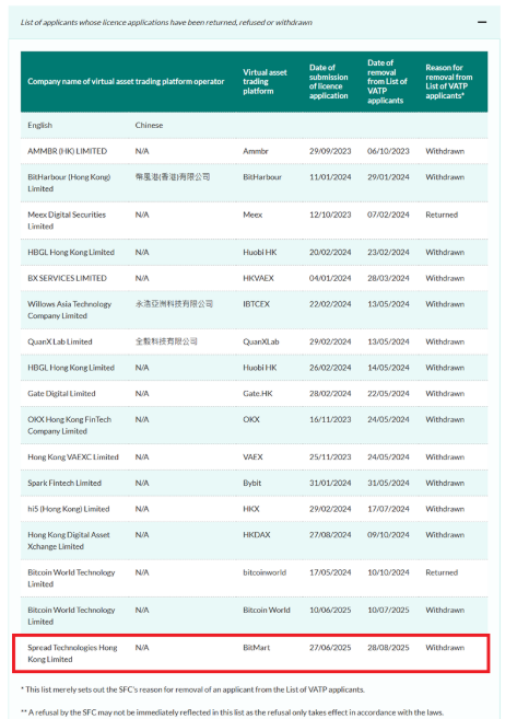 According to the Hong Kong Securities and Futures Commission (SFC), BitMart pulled its application on Thursday, aligning with a trend that began in 2024, when top exchanges like Bybit, OKX, and Gate also withdrew their applications ahead of the regulatory deadline.