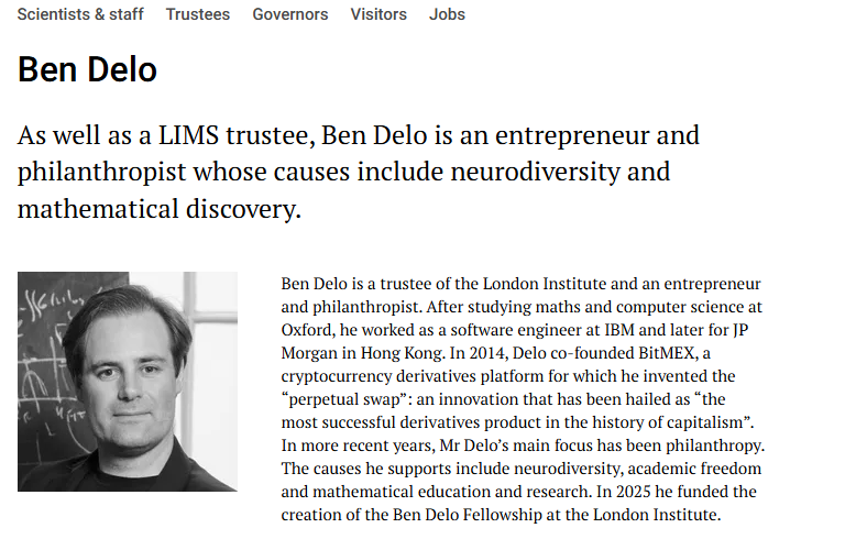 Delo co-founded BitMEX in 2014 and pleaded guilty to U.S. banking violations in 2022, paying a $10 million fine. He received a presidential pardon from Donald Trump in March 2025. As a LIMS trustee, Delo has previously funded initiatives supporting academic freedom, neurodiversity, and mathematical research. In 2025, he established the Ben Delo Fellowship at LIMS to advance theoretical physics, pure mathematics, and artificial intelligence research.