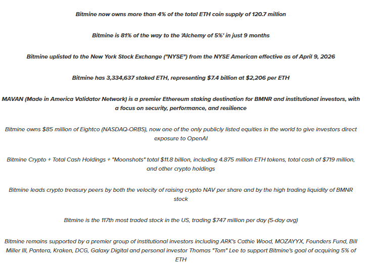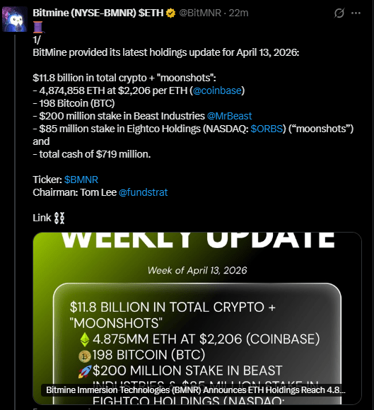 Bitmine has staked 3.33 million ETH, representing about 68% of its holdings, generating approximately $212 million in annualized staking revenue at a reported 2.89% yield. The company’s total assets, including cash and equity positions labeled “moonshots,” stand at $11.8 billion, which includes $719 million in cash and strategic investments such as a stake in Beast Industries and a position in Eightco Holdings.