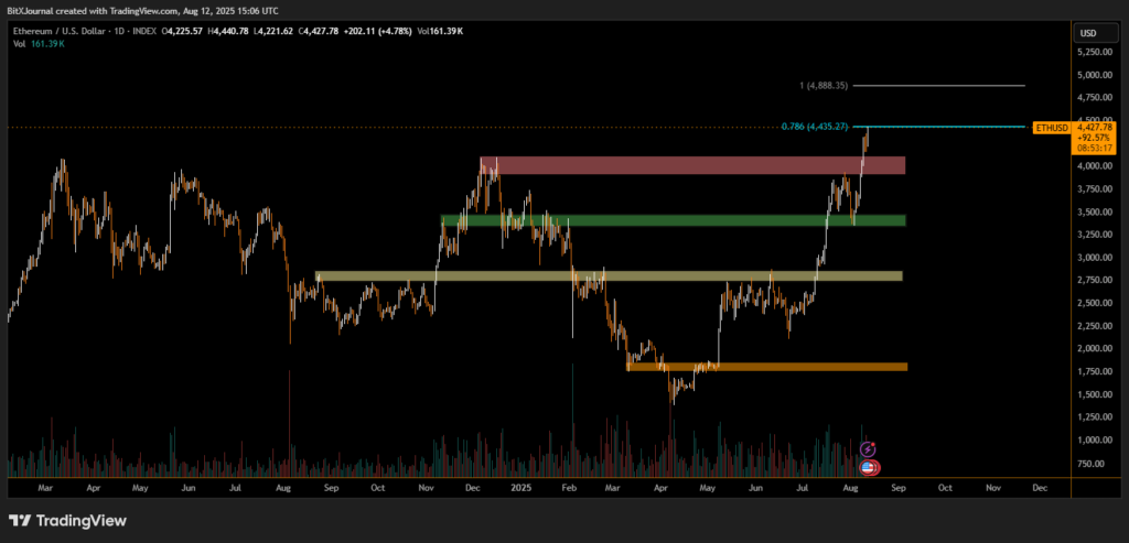 Ether has climbed over 21% in the past week, trading around $4,408 at the time of writing. Analysts point to growing corporate adoption as a key driver, with institutional buyers helping to tighten available supply and push prices toward record highs.