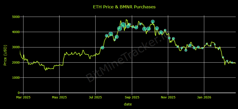 Despite mounting paper losses, Bitmine continues to accumulate. Last week, the company purchased 45,749 ETH at an average price near $1,992, signaling ongoing conviction in Ethereum’s long-term potential.